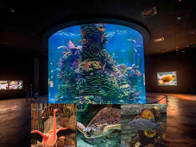 a) Tanques gigantes: Albergan tiburones, rayas, tortugas y miles de peces tropicales. El túnel submarino de cristal es uno de los favoritos del público.
