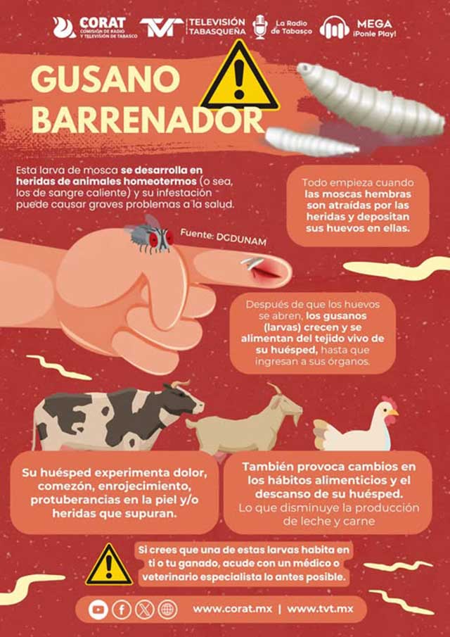 La mosca adulta del gusano barrenador deposita de 200 a 300 huevos cerca de una herida abierta en el ganado. En menos de 24 horas, las larvas nacen y penetran la carne. Este proceso puede continuar si no se detecta y trata oportunamente. La mosca puede repetir el ciclo en varios animales, lo que facilita su propagación.